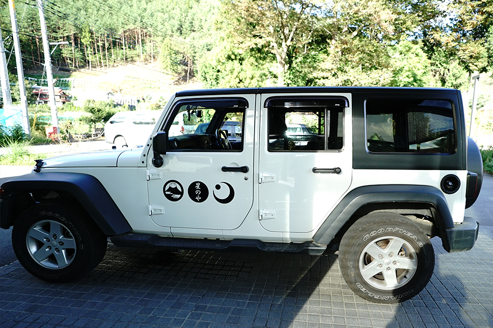 星のや富士さんのジープに乗せてもらい、丘の上に登ります。
