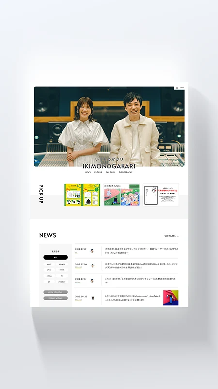 いきものがかりさまのオフィシャルサイトを作らさせていただきました。2人体制となったタイミングでのリニューアルでしたので、Alata(あらた)というフォントを起用し、ファン層が広いので様々な年代の方でも見やすいようにシンプルかつ、フォントサイズも大きめで作成しました。