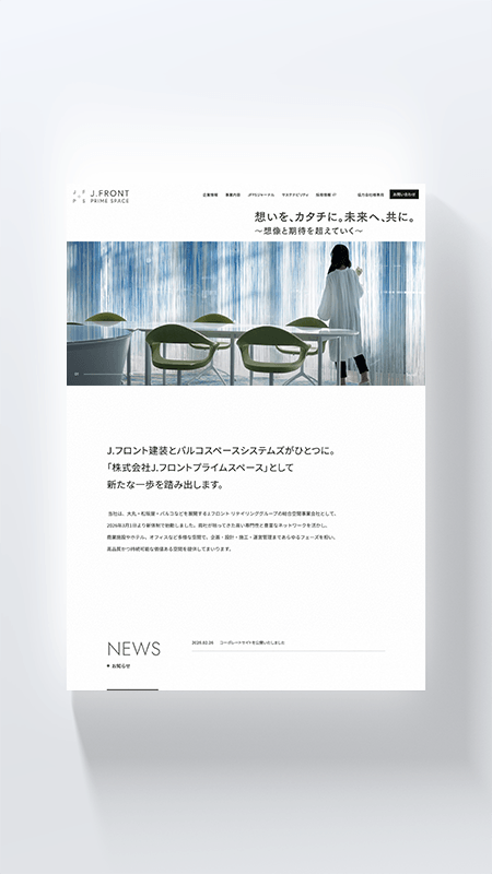 株式会社Jフロントプライムスペース様のコーポレートサイトを企画・制作しました。2025年公開の採用サイトに続き、新会社としてのブランドイメージを定義する役割を担うプロジェクトです。クライアントと共に企業の「らしさ」を言語化し、コンセプト設計からサイト構造・デザインへ展開。上質な余白設計と繊細な表示アニメーションでブランドの品格を表現しながら、情報量の多いコンテンツでも読みやすさを保つ設計を目指しました。