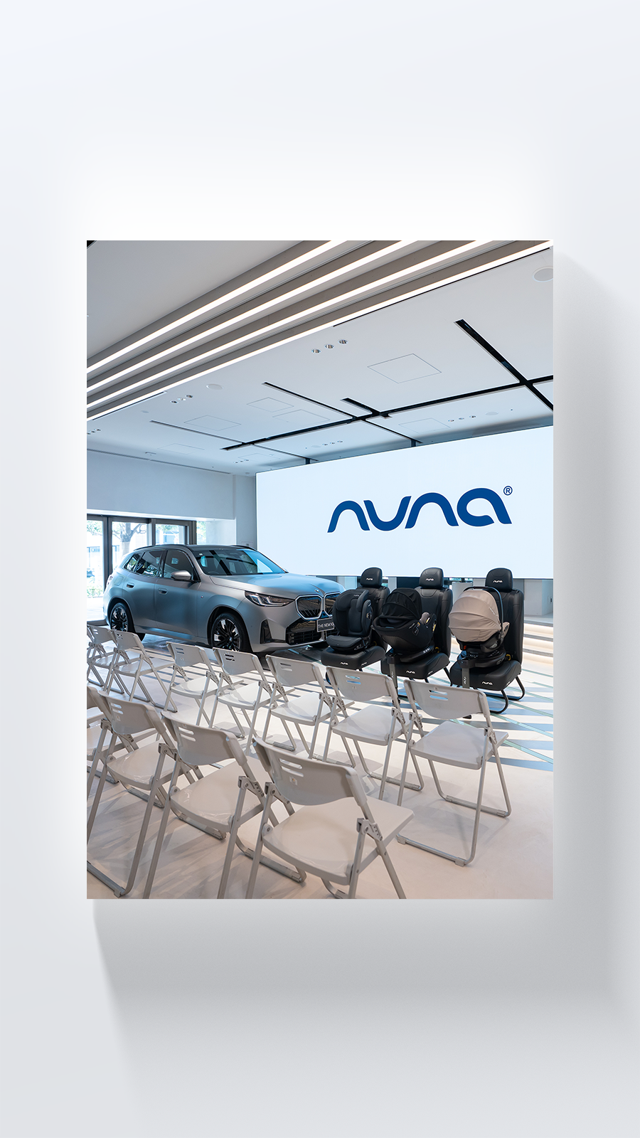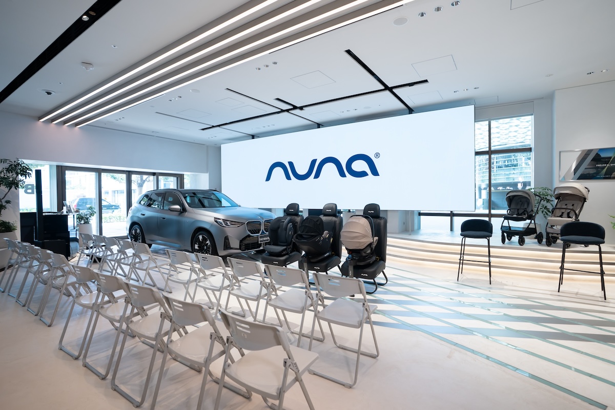 麻布台ヒルズ1FにあるFREUDE by BMWにて開催。BMWのブランドストアとなる会場では、チャイルドシートの取り付けはもちろん、BMWの新車展示が展開されており、講習以外にもパパ層の興味を惹く空間作りにこだわりました。ドアオープン後は、nunaロゴケーキピックのついたウェルカムフードやドリンクで来場者をもてなしました。